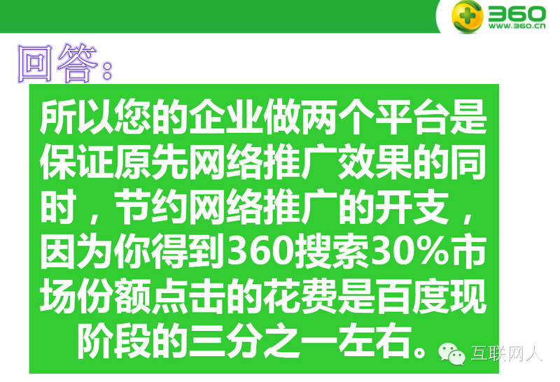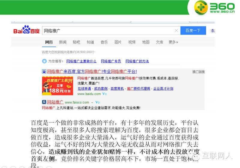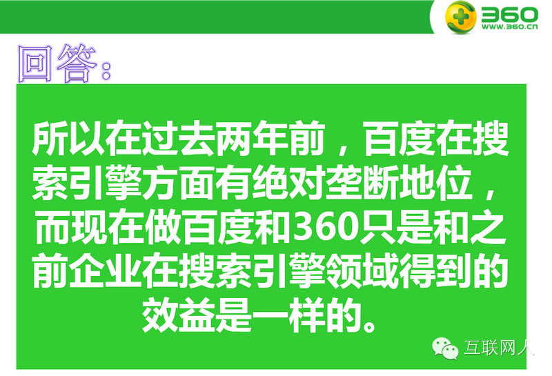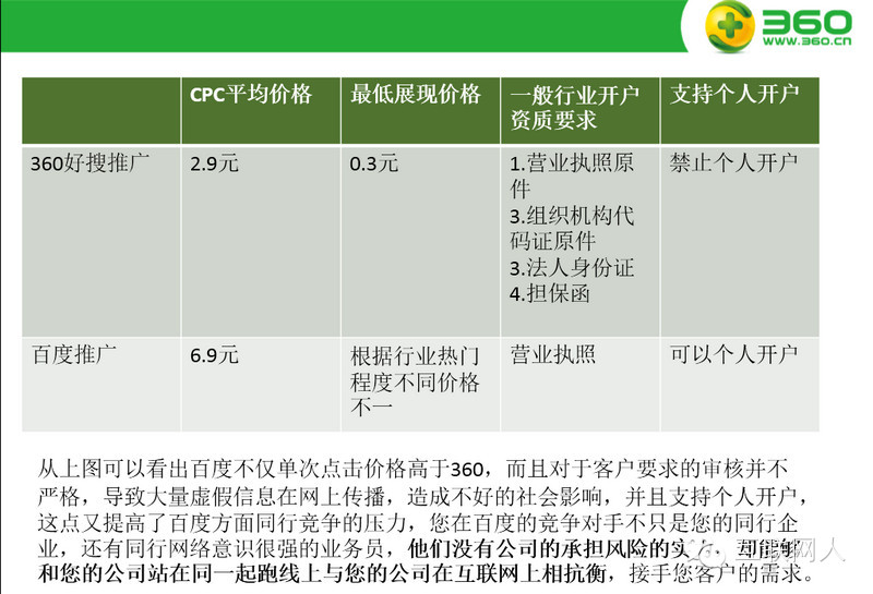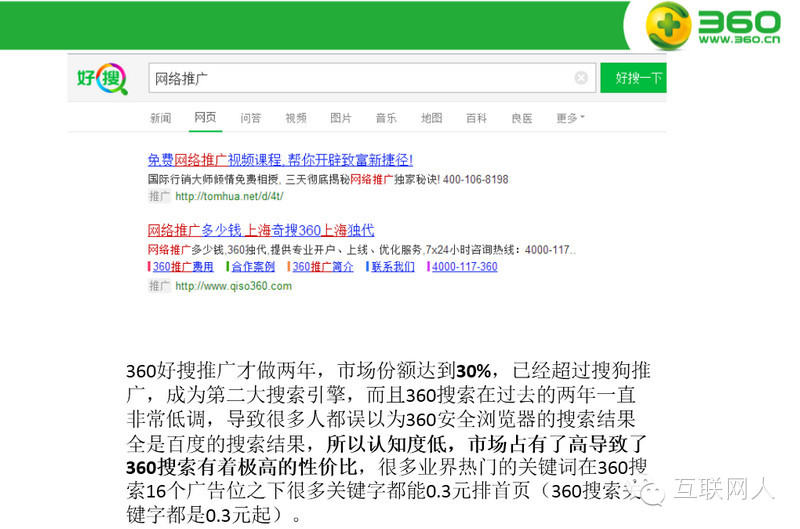 因其百度近两年竞价广告透支了不少用户的信用,再加上市场占有率连年减少,目前百度推广的优势已不如从前。这里不得不提的是360好搜,这两年360好搜的占有率由最初的5%左右,到现在25%左右。外加360好搜的营销策略比较那啥,它没有刻意去宣传它的搜索引擎,反倒利用360浏览器的高占用率,把默认搜索改成360好搜,而很多用户是不知道搜索引擎还分百度跟360或其他,在这类用户眼里,能搜到他想要的东西就完事了,什么搜索引擎根本对他没影响。而这类用户,通常对电脑和互联网不会特别熟悉,也就是说,他搜到的东西,是不是广告他有时分不出来,自然这类用户的质量也比较高。